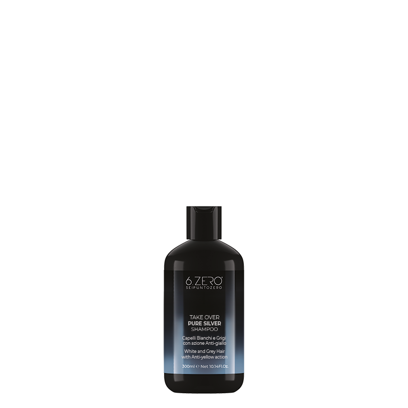 Szampon Take Over Pure Silver do włosów białych i siwych. Oczyszcza, neutralizuje żółte odcienie i stabilizuje kolor, pozostawiając włosy jasne, chłodne i pełne blasku.